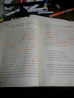 2008年09月25日 見ろ、単語がゴミのようだ。 本当に今更の話ではあるが、僕は単語の勉強を真面目にしたことがない。 長文の読めない最も大きな理由は単語がわからないからであると思っている。 単語がわかって初めてその先の構文等のステップに進めるのだ。 写真は早慶上智のどれかの英文であるが、この文章の中でオレンジの線が引っ張ってある分だけわからない単語がある。これでは…。 地味な作業ではあるが、長文中心の勉強を進めていく上で、単語ノートをしっかり作っていこうと思う。 早大プレの合格可能性が35%しかなくて、気合いを入れ直すことにしたもきょであった。